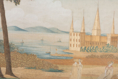 identified Elizabeth Leavitt. 1806. / A View of Cronberg Castle near Elsineur [sic], eglomise mat