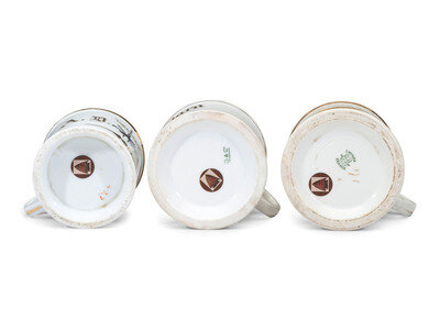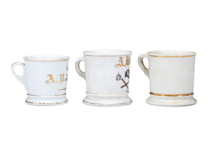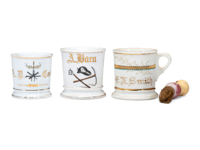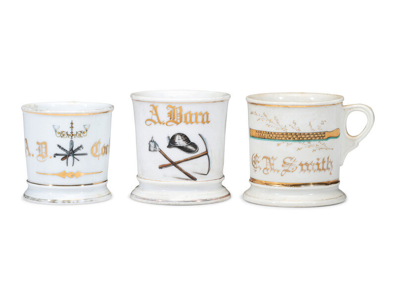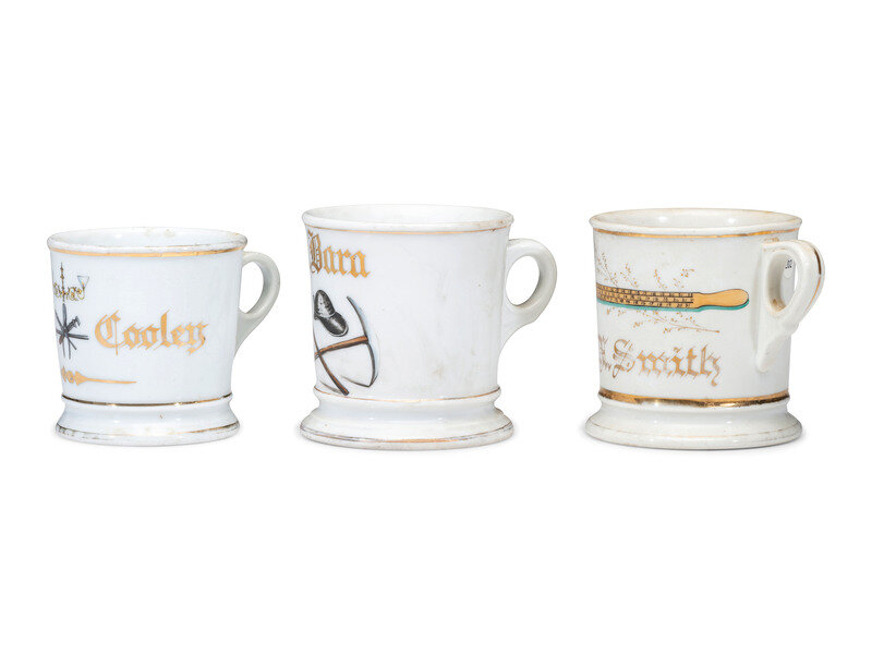 comprising a miner's mug identified A. Bara, a carpenter's mug identified G.N. Smith, and a repairman's mug identified A.D. Cooley, all with symbols of the respective trades.