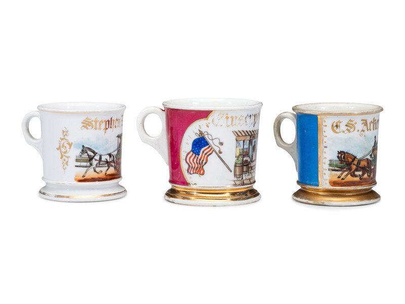 comprising two mugs depicting grocery delivery wagons identified Stephen Zicarelli and C.S. Ackerman, and a mug identified Giuseppe Comarelli depicting a storefront flanked by American and Italian flags.
