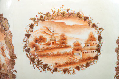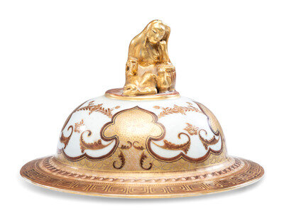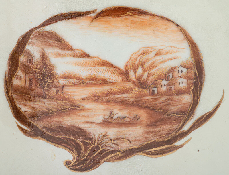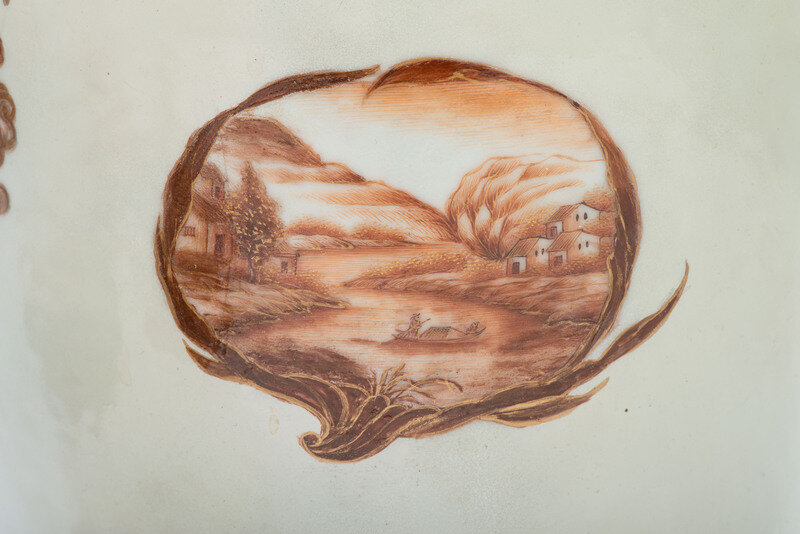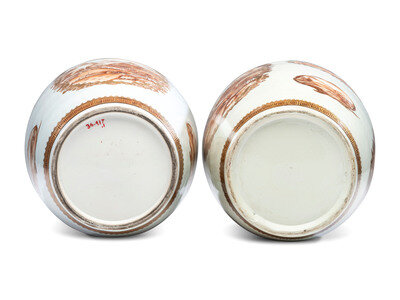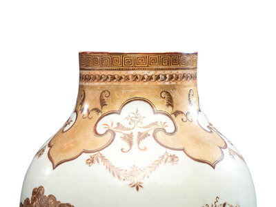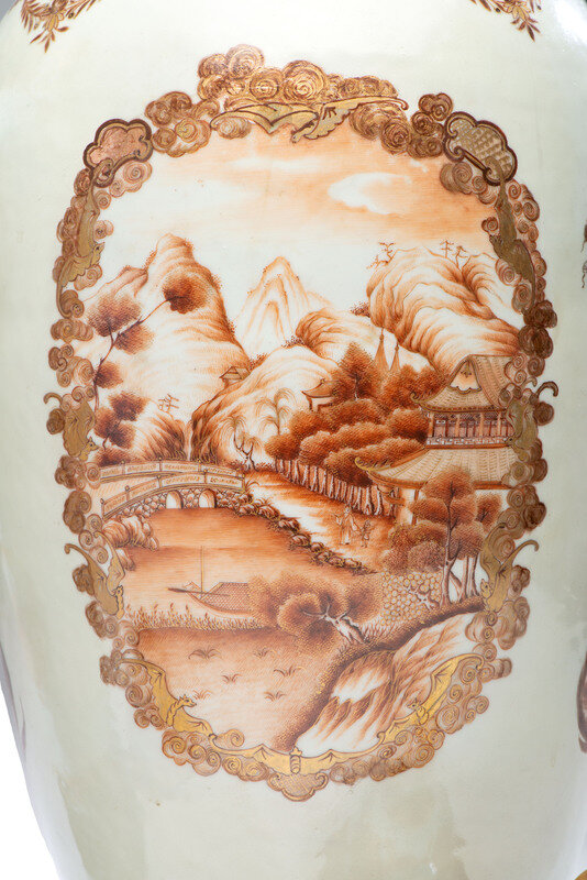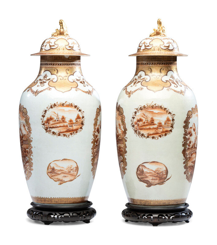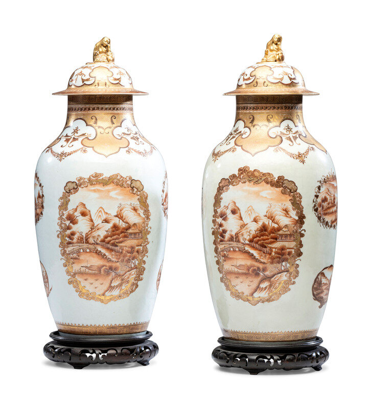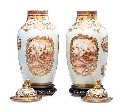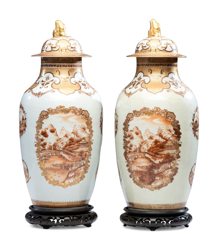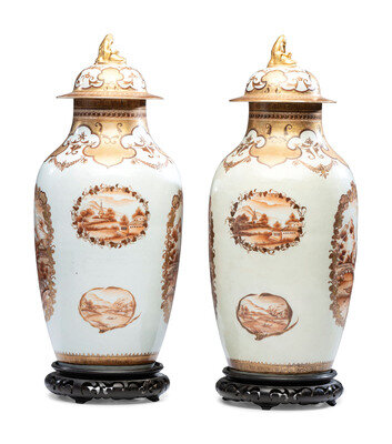 A Pair of Chinese Export Parcel Gilt and Sepia Decorated Porcelain Covered Urns