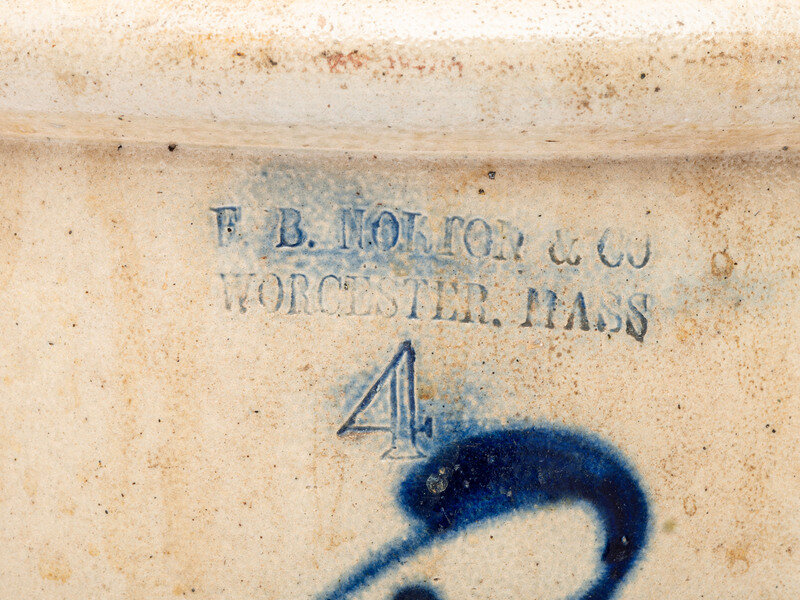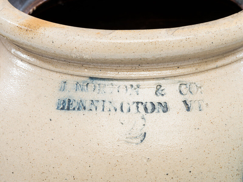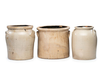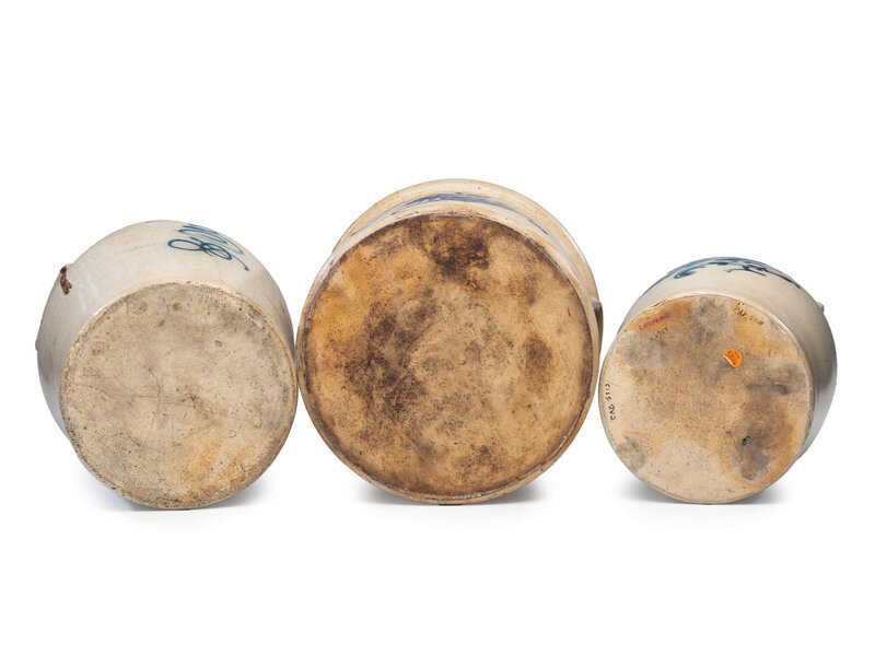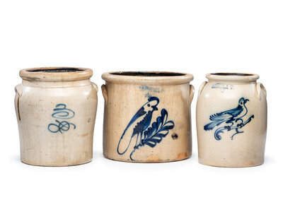 comprising a J. Norton and Co. two-gallon jar with incised capacity mark and bird decoration, an F.B. Norton and Co. four-gallon crock with incised capacity mark and bird decoration, and an unmarked three-gallon crock with brushed capacity mark.