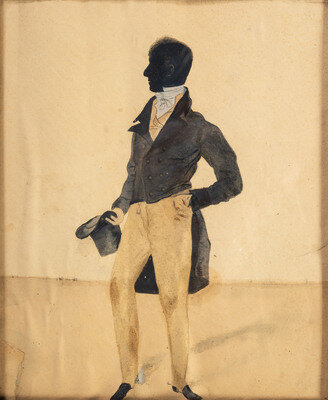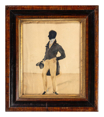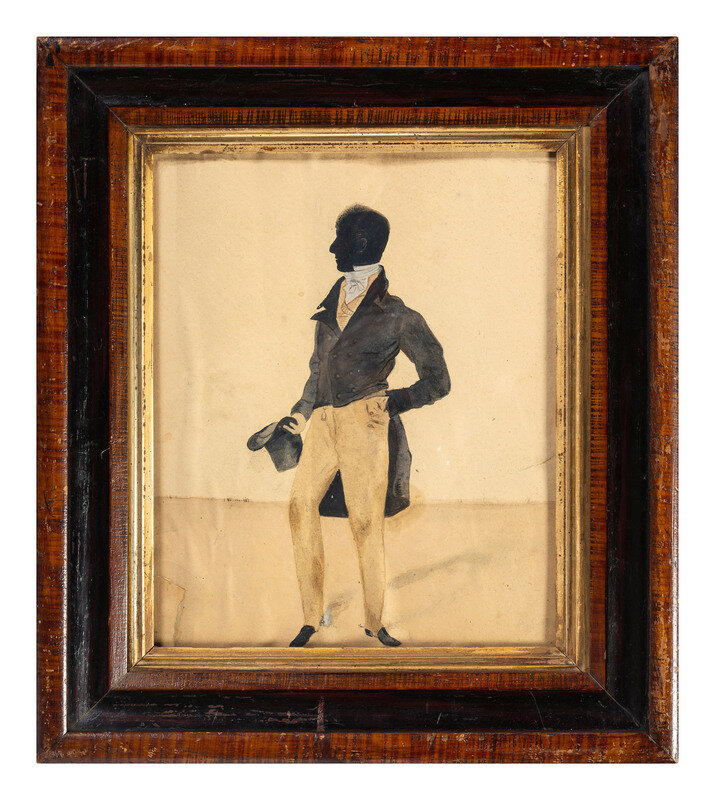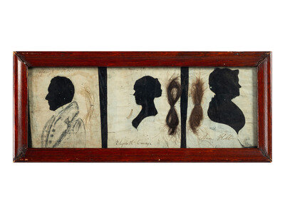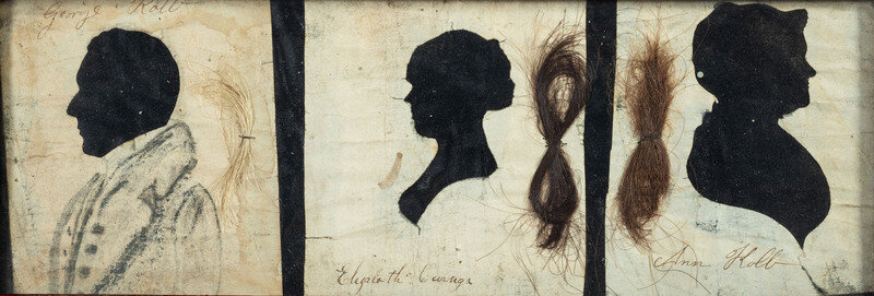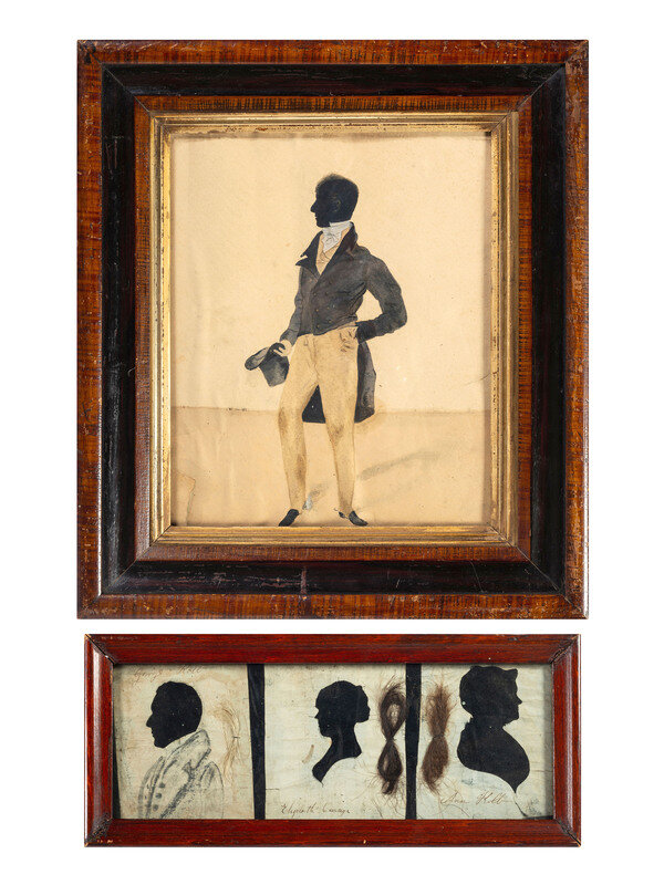 comprising three cut-paper and velvet-mounted examples depicting members of the same family, each with inscribed identification and locks of hair, and one full-length watercolor example of a standing gentleman.