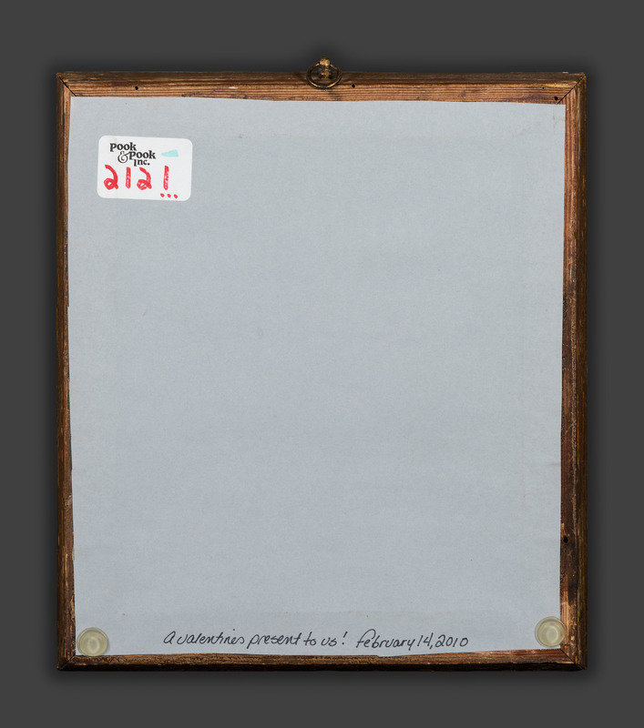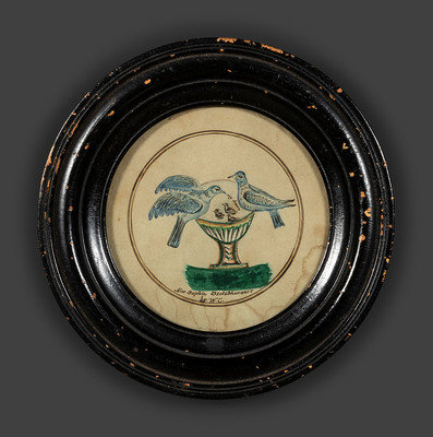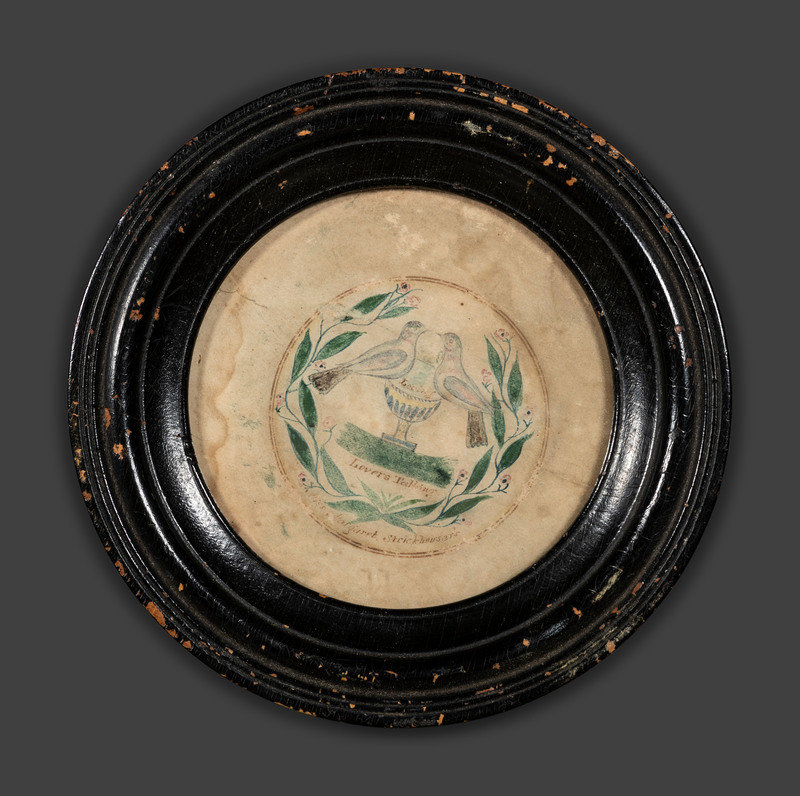 together with a pen and ink drawing of a sailboat on a river and two watercolor valentines featuring birds, identified Lovers Talking / Miss Margaret Strickhousers and My dears / Miss Sophia Strickhousers / by W.C.