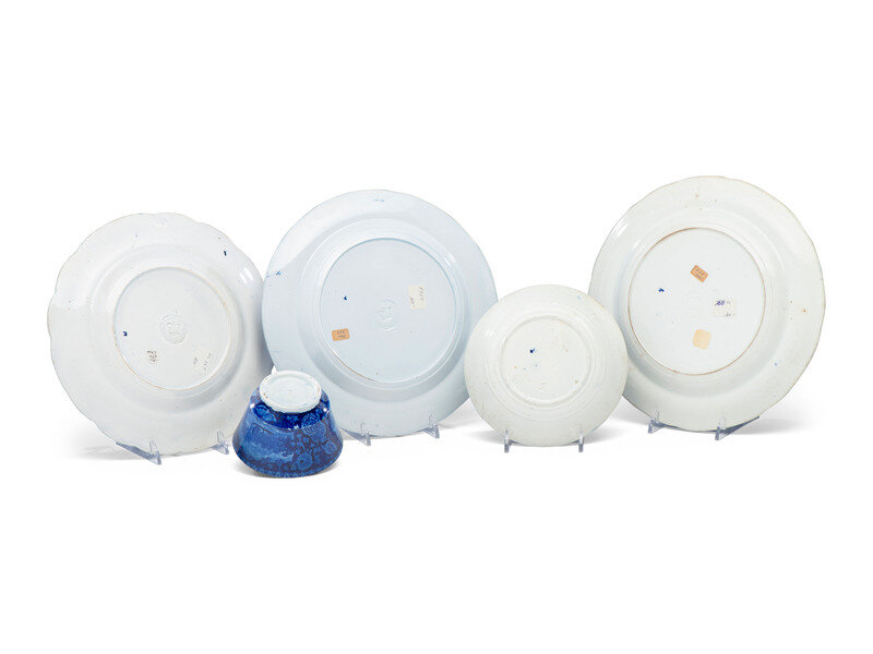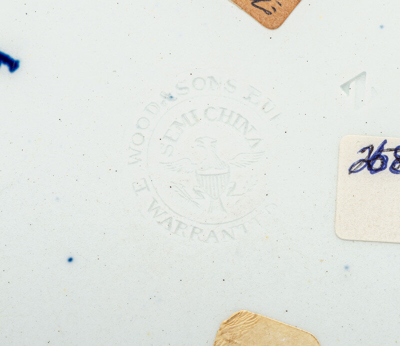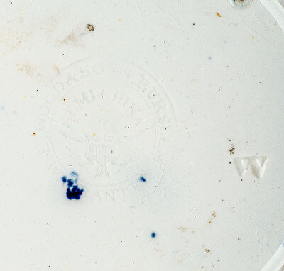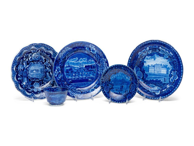 comprising a Clews 'Landing of Lafayette' plate, a Clews 'America and Independence' plate, a Wood & Sons 'Marine Hospital' plate, and a Wood & Sons 'Wadsworth Tower' cup and saucer.