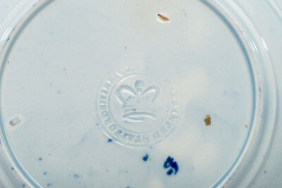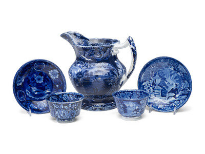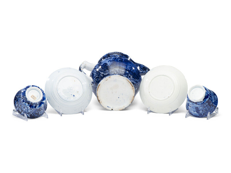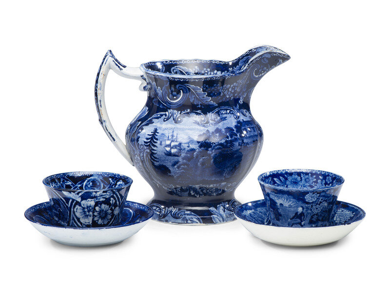 A Historical Blue Staffordshire Pitcher and Two Cups with Saucers