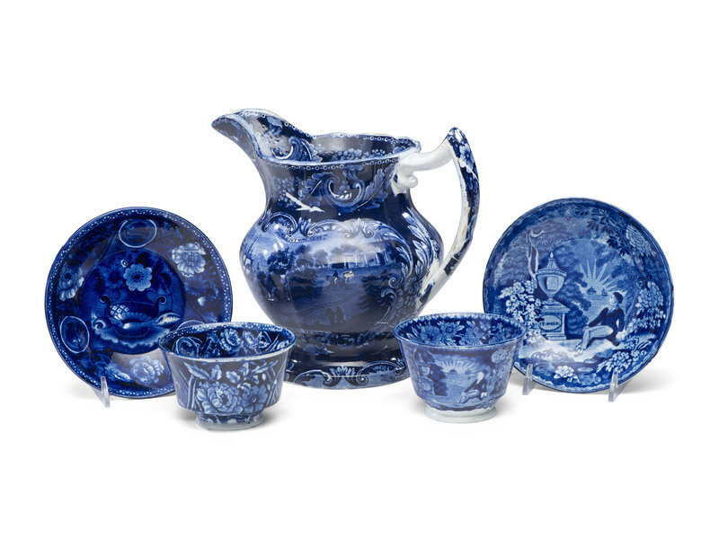 comprising a 'Washington's Seat' pitcher, a 'Franklin's Tomb' cup and saucer marked Wood, and a flower and urn cup and saucer marked Clews.