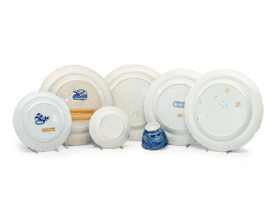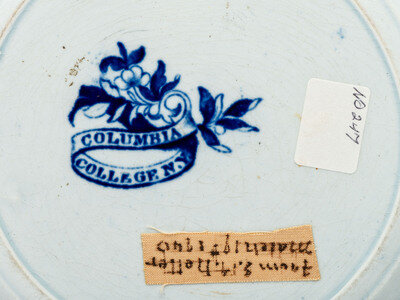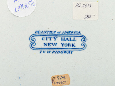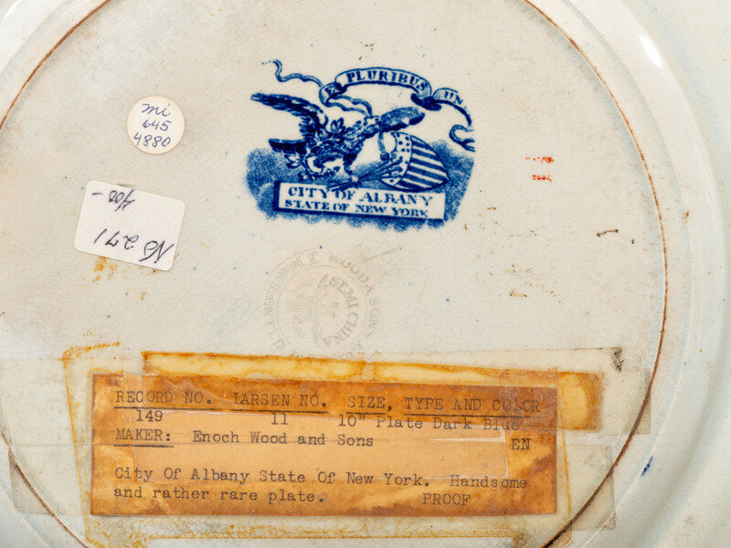 comprising an eagle and shield cup and saucer set, two plates with views of the Boston State House by Ridgway and Rogers, a saucer with view of Columbia College, a Ridgway City Hall New York plate, and a Wood & Sons City of Albany plate.