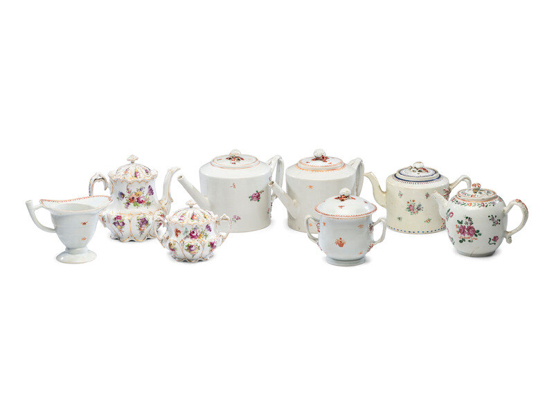comprising teapots, a creamer, tea bowls and saucers of varying size and decoration.