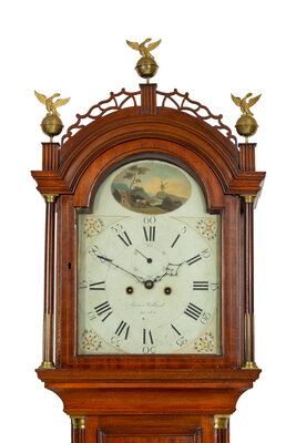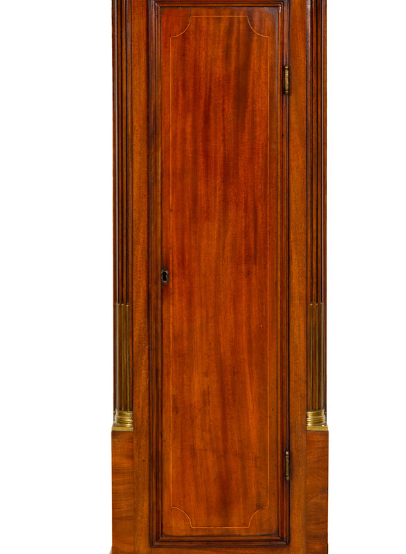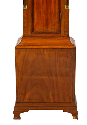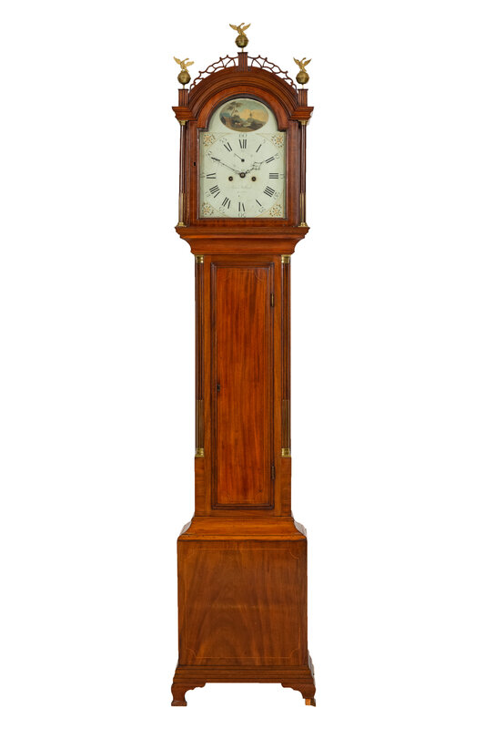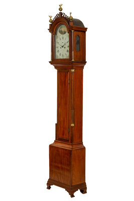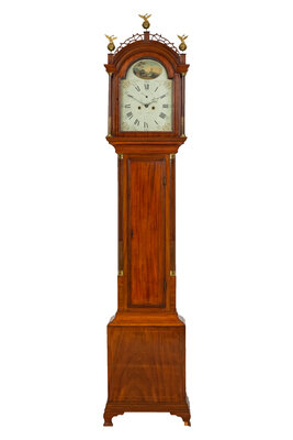 An American Mahogany Brass-Mounted, Inlaid and Carved Mahogany Tall Case Clock