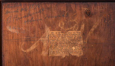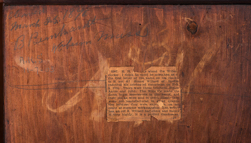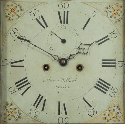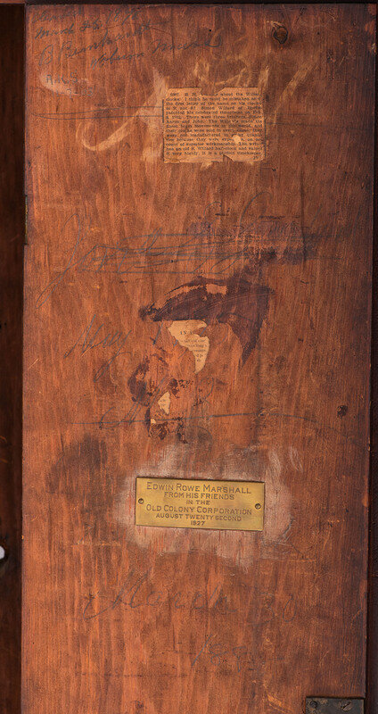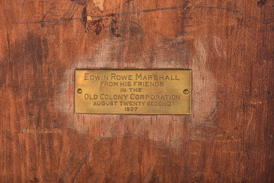 the dial inscribed Aaron Willard / BOSTON, the interior of the trunk door showing various pencil inscriptions and bearing a brass plaque inscribed Edwin Rowe Marshall From His Friends in the Old Colony Corporation August Twenty Second 1927, the hood with brass eagle finials.