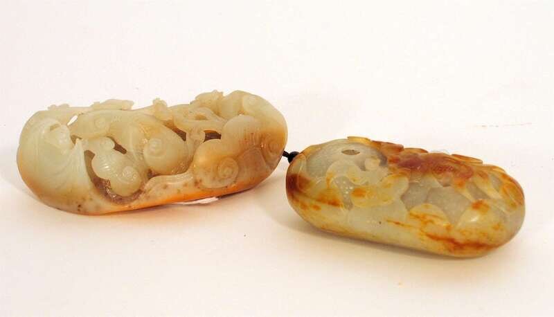 Well reticulated scroll weight worked to show lingzhi and bats, together with a lattice work oval coupe or perfumer.