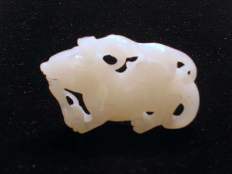Carved from a single section, well reticulated to show a Fu lion surmounted by pup.