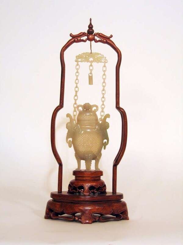 Well-carved covered vase, supported by chain-link hanging rings to shoulders, reticulated body and cover, raised on four out-swept legs, wood stand.