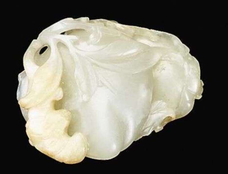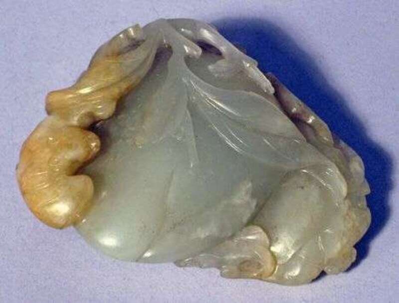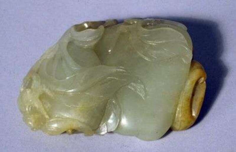 Fine Chinese celadon and russet 'double peach and bat' scroll weight 18th century