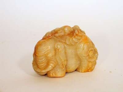 Well carved single section to show boys supporting linked coins over a robust elephant.