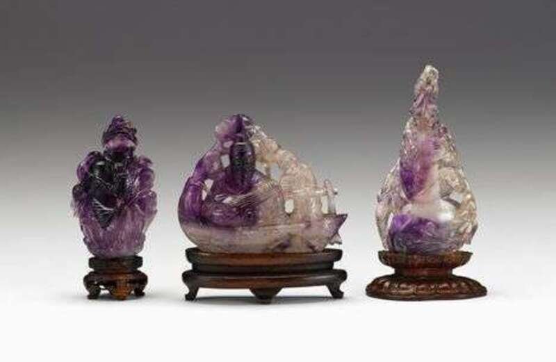 Comprised of a tall double gourd snuff, an ovoid riverscape carved snuff, together with a sampan model, all on wood stands.