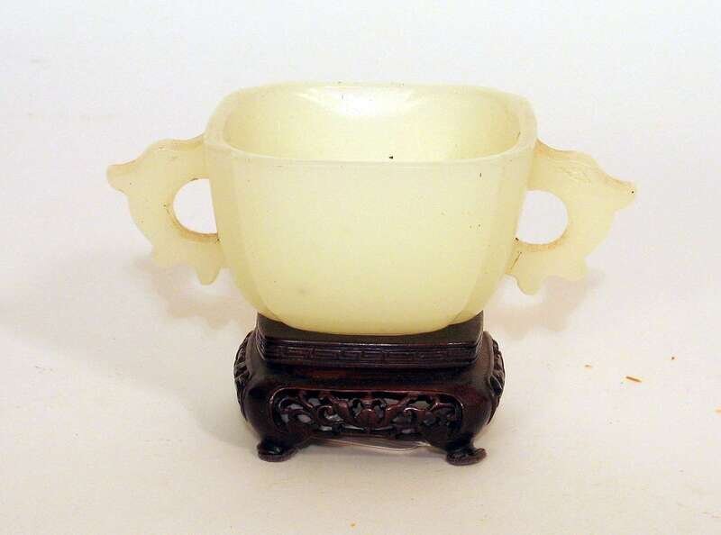Of fluted square form, molded mask handles raised on square foot, wood base.