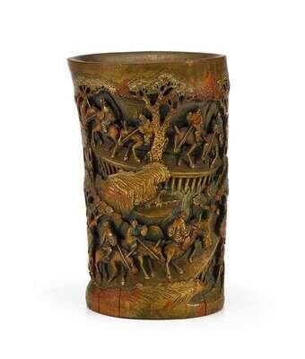 Of tall cylindrical form, of slightly convex slope, well carved outer-wall showing immortals on donkey ascended a mountain landscape, signs of old green and gold paint.