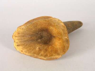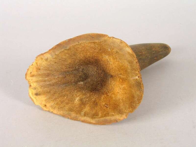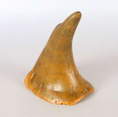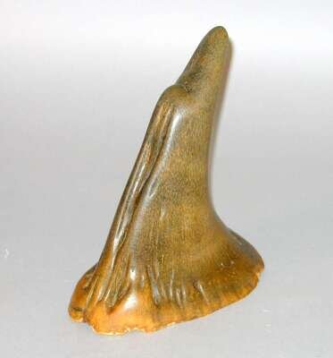 Tapering tip stepped issuing from a wide base, natural uncarved state, dark coffee and blonde tones.