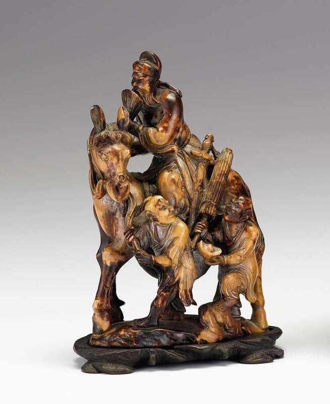 Well carved of dark to golden brown hue, carved to show a horseman with attendants, good stand.