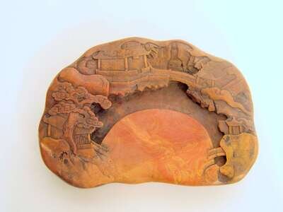 Of oval form, carved in high relief to show village hamlet, crescent shaped ink palette, script verso.