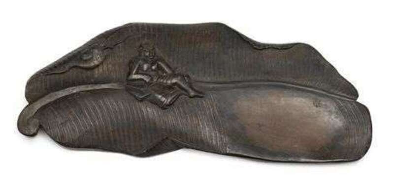 Long leaf form, incised to show vines and seated Buddha, framed by Fu bat, script verso.