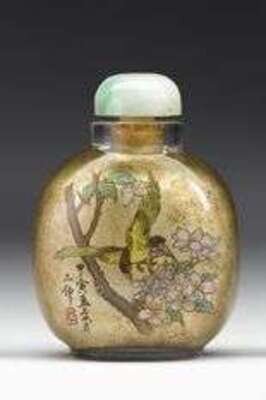 Of wide baluster form, well painted interior of long tails and floral sprigs, jadeite stopper.