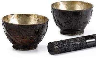 Pair of Chinese carved nut -shell and white-metal cups 18/19th century