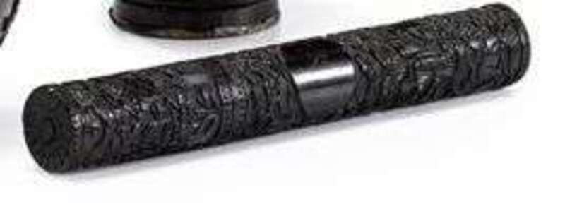 Of long cylindrical form, very well carved in low relief to show a profusion of Buddhistic symbols, figures and foliate sprigs.