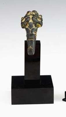 Hook head in the form of mask, and the head of a bird to narrowing end, good signs of gold gilding, modern stand.