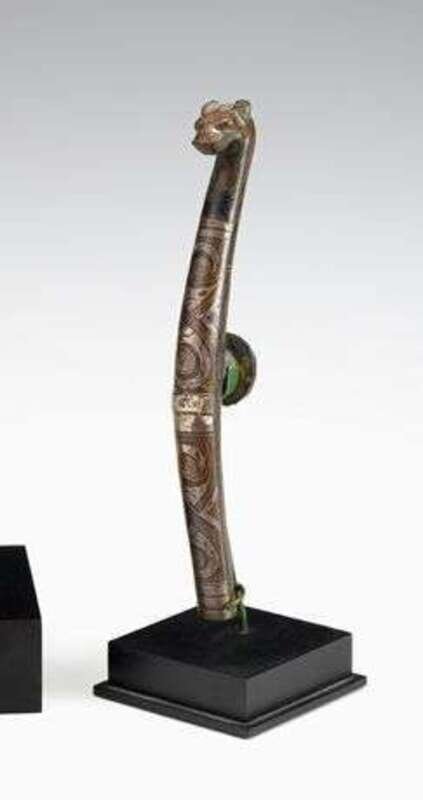 Of convex serpentine form, headed hook issuing from a widening body inlaid with silver to show geometric patterns, circular knop to rear, modern stand.