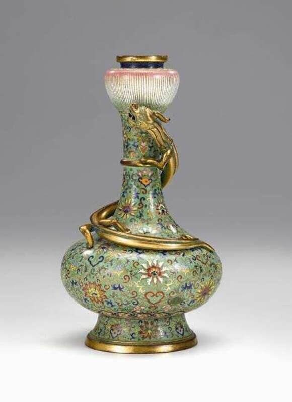 Gilt bronze rim over a blue Greek-Key band and pink enamel lotus head issuing from a slender neck and globular body, enameled to show Indian lotus and scrolling leaves on a green ground, mounted coiled qilong to shoulder and neck, gilt bronze circular base, drilled.