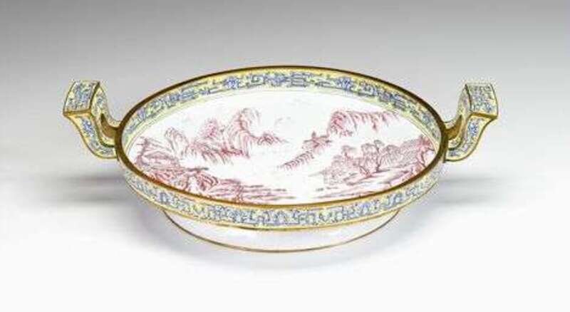Raised on a tall circular foot enameled white with gilt-metal mounts, the rim and archaic form handles enameled yellow and blue to show masks and scrolls the central medallion enameled puce to show a mountainous landscape.