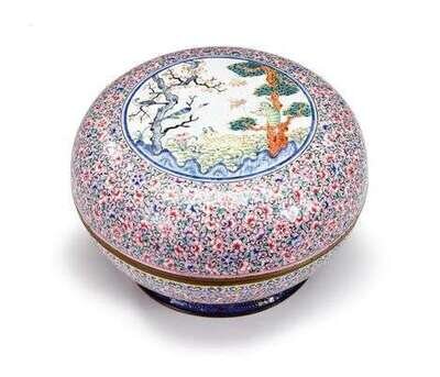 Of cylindrical form, decorated with a central medallion of animals among a forest landscape, on a ground of well painted floral scrolls, matched base, on a circular blue and gilt decorated foot, green interior.