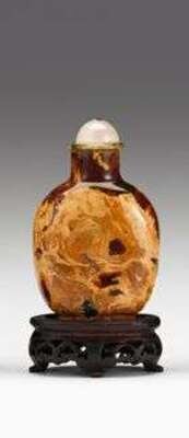 Of shouldered ovoid form, of transparent honey and coffee tone, rose quartz stopper and wood stand.