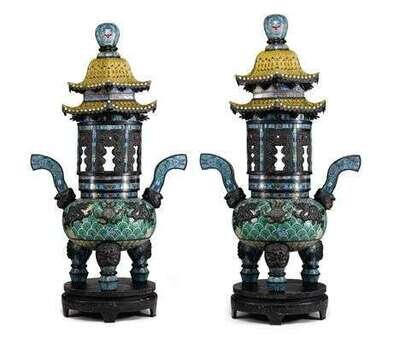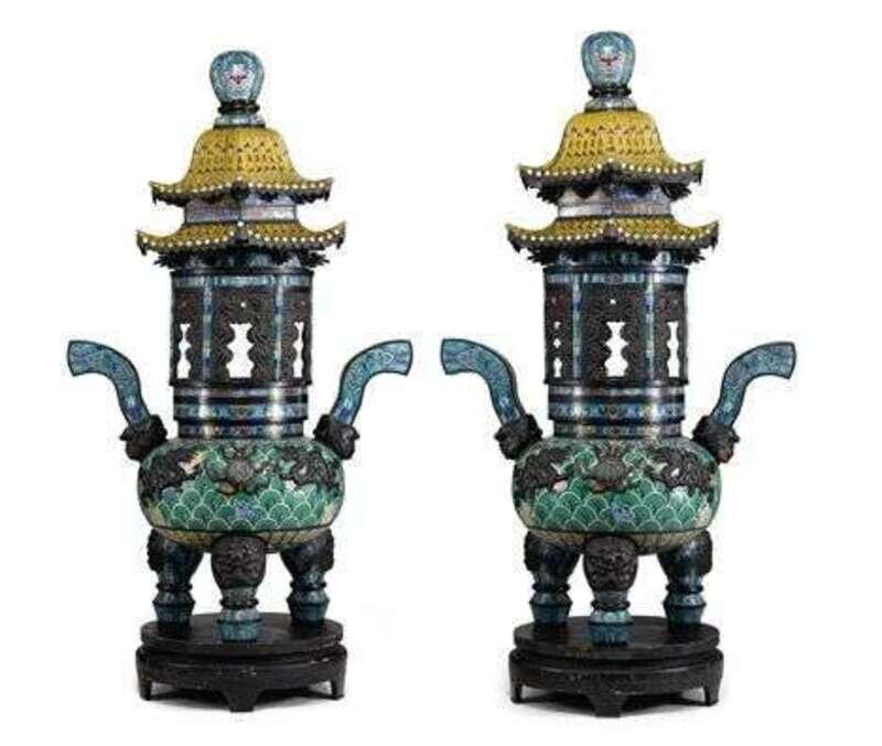 Large pair of Chinese cloisonne, jadeite and copper lanterns 20th century