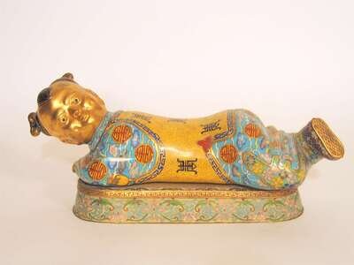 Modeled after earlier examples, reclining boy enameled to show yellow tunic and gilt-metal head and feet, over flower scroll decorated oval base.