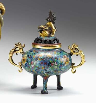 Heavy globular body covered by gilt fu-lion handle, pieced dome rim, over twin handle tripod base, enameled to show bats and Indian lotus scrolls to blue ground.
