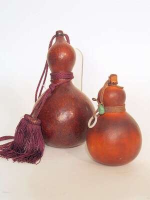 The largest of typical form, possibly enhanced with reddish lacquer, arched stopper and hardwood rim, together with a small blonde gourd with white and green jadeite toggles.