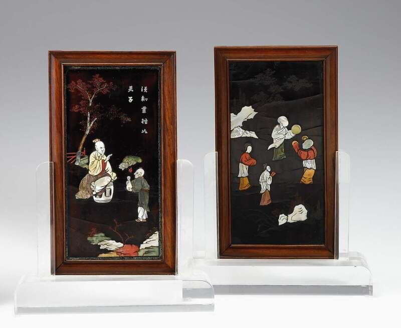 Two Chinese lacquer and inlaid huanghuali framed table screens qing dynasty