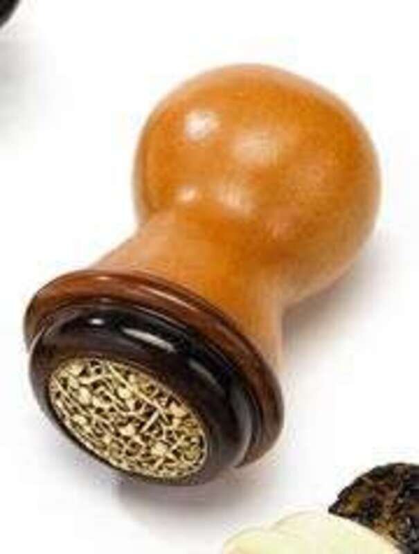 Of typical double gourd form, circular reticulated ivory cover well carved to show gourds and veins, good period patina.