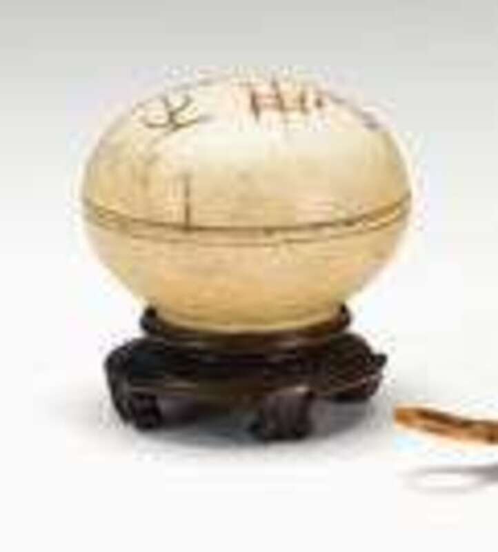 Of domed circular form, deeply incised characters and row of script to domed cover, matched rim to cover and base, raised on a circular signed foot, wood stand.