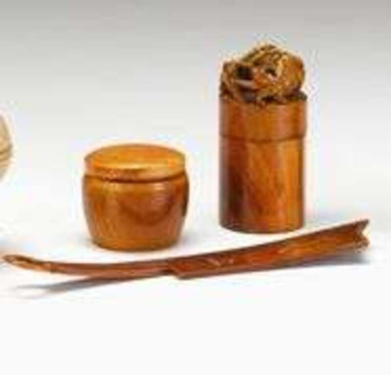 Comprised of a tall cylindrical box, the cover carved to show two Fu-lions, a small ivory box, together with a unusual convex paddle form ladle, incised to show four characters.