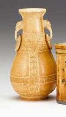 Of slender Hu form, everted mouth over Roman-key band, mask handles to shoulder supporting free hanging rings, archaic bands and recessed panels worked to body, over associated wood base.