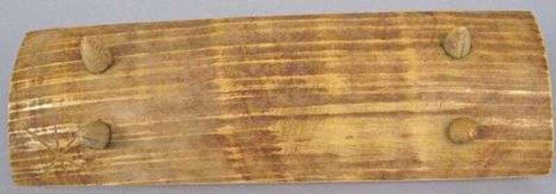 Of concave form, wide rounded sides, square carved recess to widest end, interior applied with cheesecloth, raised on rounded plinth feet, minor ink stains to body.