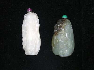 The largest of white hue carved to show an immortal flanked by strings of coins, together with a dark celadon figural landscape carved snuff.