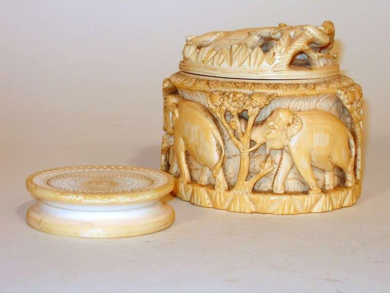 Of oval domed form, carved to show elephants and blossoming trees, together with a circular screw box.