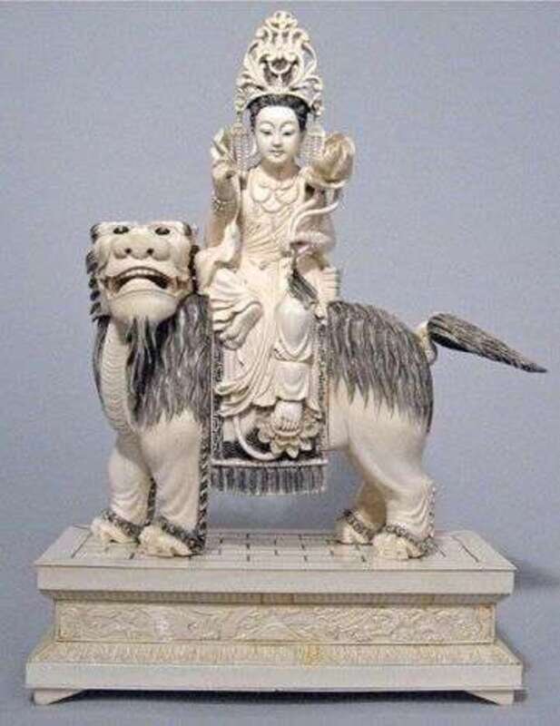 Chinese elephant ivory model of Quanyin on a mythical beast