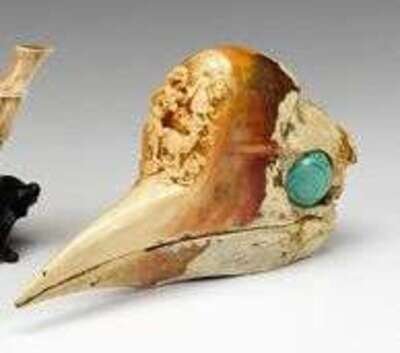 Full skull and beak, crest carved to show figural landscape and script to side, malachite eyes.
