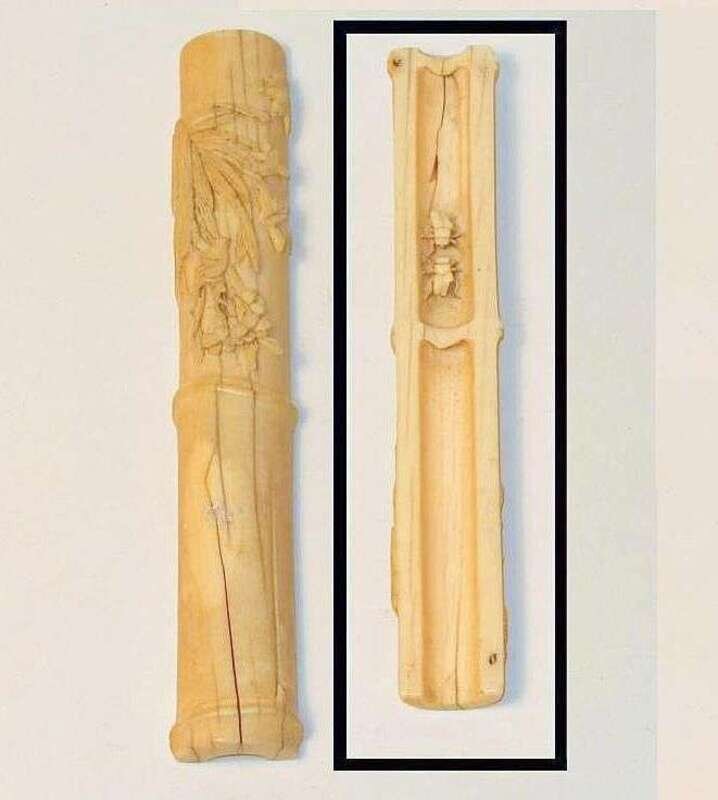 Of convex simulated bamboo form, well carved to show a floral sprig to top and insect to interior.